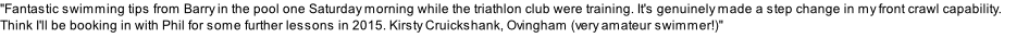 I also then attended some open water coached swimming sessions which gave me an increased confidence. I completed my first triathlon in late 2011 and I can honestly say that without Phil, Barry and Judith I would not have enjoyed me experience anywhere near as much as I did. I have signed up to some events already for 2012, this time without any alcoholic influences.